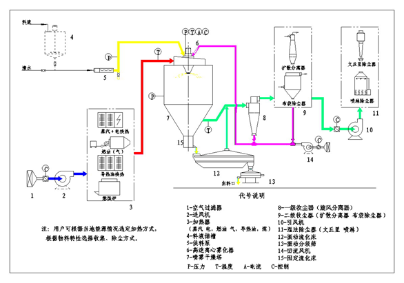 閉路循環離心噴霧干燥機熱煙道氣流動通過其中的大部分熱能被傳遞到空氣/蒸汽混合物中循環的閉合干燥空氣回路的熱交換器。經冷卻的煙道氣(廢氣)離開熱交換器,并通過排氣鼓風機,被在140-180 ℃的溫度下釋放到大氣通過排氣堆棧。